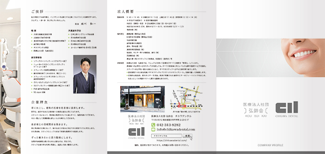 歯科医院を運営する医療法人の採用を目的とした会社案内パンフレットのデザイン制作事例です。